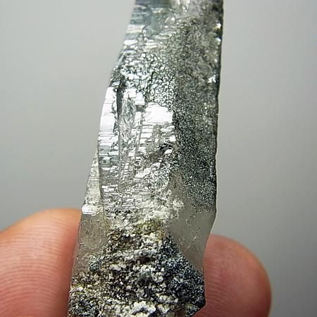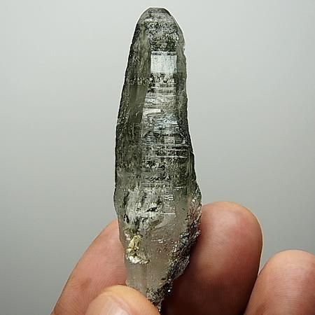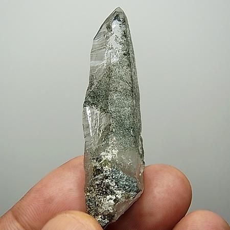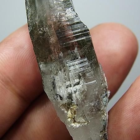 Chlorite and mica inclusions in quartz. Curved/twist growth formations comes once in a blue moon and to have one that is damage free is quite remarkable. Good transparency with chlorite coating on the back three sides of the crystal.