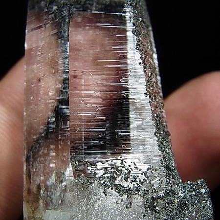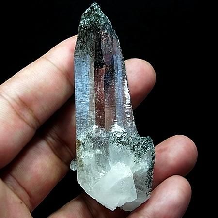 Excellent gloss and clarity with biotite inclusions at its base. Natural formations on the tips with slight coating of chlorite on some parts of the crystal.