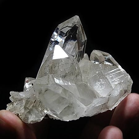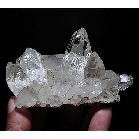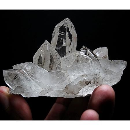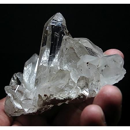 We chose this cluster mainly for its beautifully shaped center crystal and the way its outstandingly grown, supported but its surroundings. And although the points are not in its 100% pristine condition, the clarity of the whole specimen and the self healed base should make up for that. A beautiful cluster with slight chips but nothing outstanding about the damages.