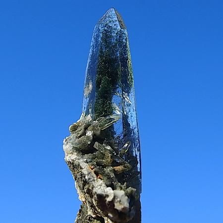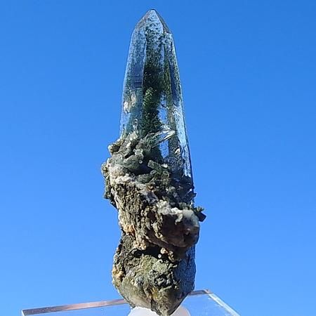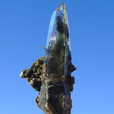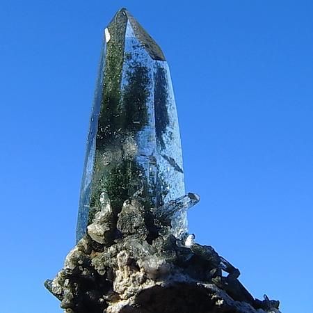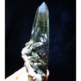 Its always overwhelming when coming across Gem chlorite pieces. This one produces a very unique cone shaped chlorite inclusions. So rare to come across these internal chlorite formations. The cluster on its matrix is not in its pristine condition however the single point is still in absolute perfection.