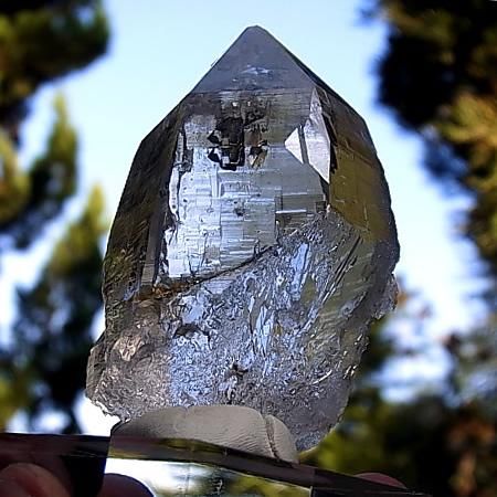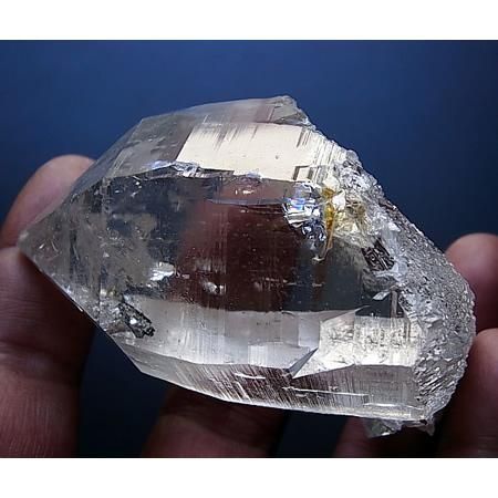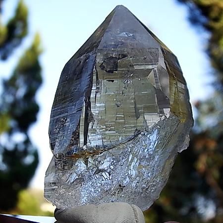 Hematite inclusions in quartz with titanite growing on the side of the crystal. The crystal has very well formed self healing (terminations) at the base of the crystal. Very good shine on 3 sides of the crystal while the other 3 sides are less in shine. At the tip which looks like a chip is natural.
