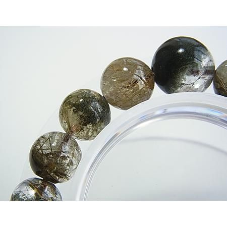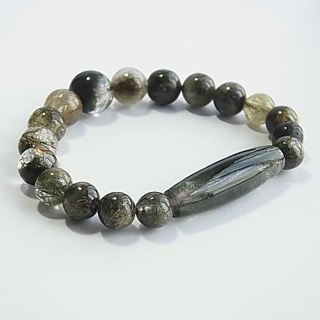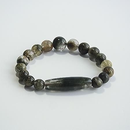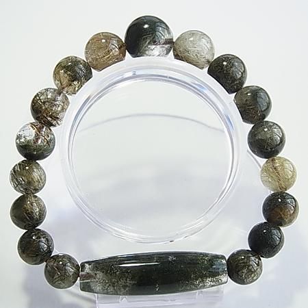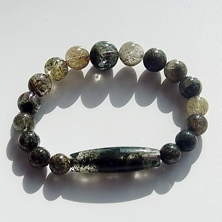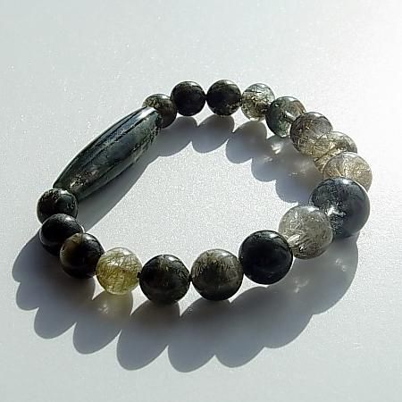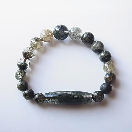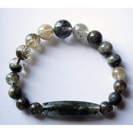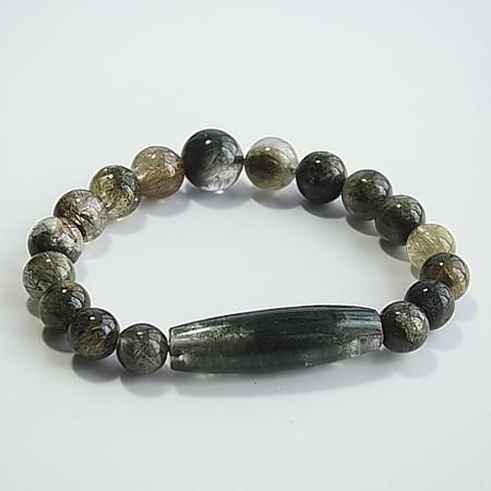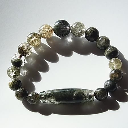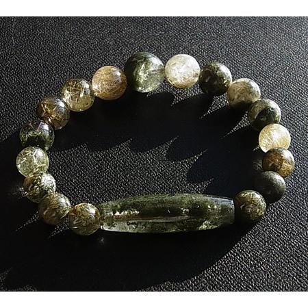 中心の細長い天珠型のクローライトビーズと、その真後ろにくるクローライトの丸玉ビーズが、